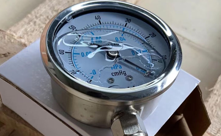 2、壓力表測壓系統(tǒng)受到被測介質(zhì)瞬間超壓沖擊,使指針回不到零位或者沖到限制釘下面;